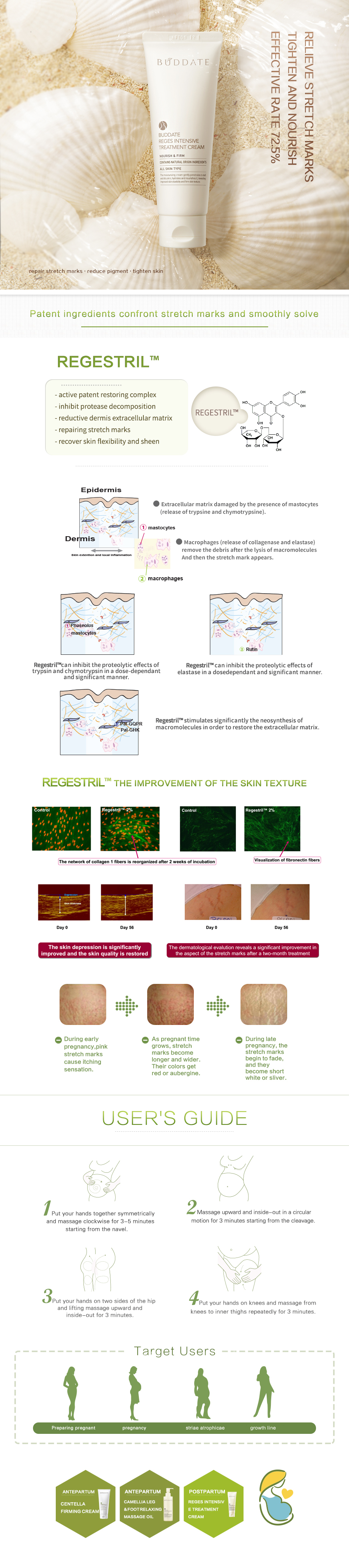 ※ Peptide factor contained contributes to fade pigmentation, improve color of pregnancy stretch marks and provide nutrition needed by skin, presenting reduplicated healing effect.